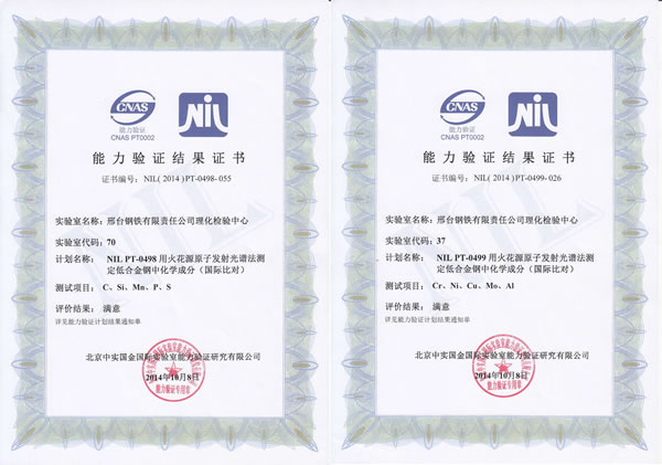 - In order to ensure the accuracy of the laboratory testing data, Physical and Chemical inspection center of Xingtai Steel actively take part in international and domestic laboratory proficiency testing organized by China National Accreditation Service for Conformity Assessment(CNAS). In 2014, Xingt…