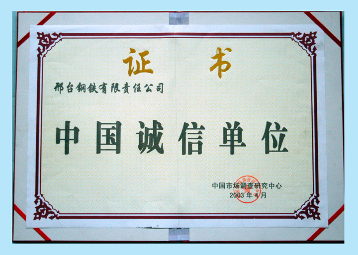 Since 2003 to 2006, Xingtai Steel had won in succession the certificate of National Products Quality-Inspection-Free.