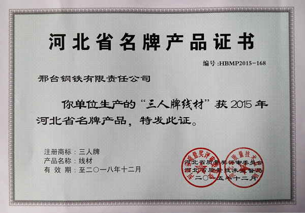 “三人牌線材”獲2015年河北省名牌產(chǎn)品