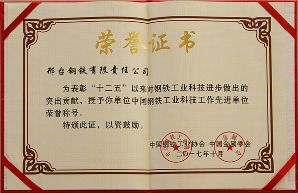 2017年10月,邢鋼被中國鋼鐵工業(yè)協(xié)會和中國金屬學(xué)會聯(lián)合授予“十二五”中國鋼鐵工業(yè)科技工作先進(jìn)單位榮譽(yù)稱號。
