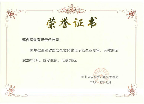 2014年,邢鋼安全文化建設(shè)取得初步成果,首批獲得“省級安全文化建設(shè)示范企業(yè)”。2017年7月,邢鋼順利通過復(fù)審再獲“省級安全文化建設(shè)示范企業(yè)”。