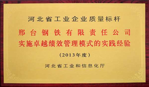 2013年7月12日,省工信廳在石家莊召開了2013年第五期國家新型工業(yè)化產(chǎn)業(yè)示范基地質(zhì)量標(biāo)桿經(jīng)驗(yàn)交流會(huì),會(huì)上舉行了省質(zhì)量標(biāo)桿授牌儀式,邢鋼公司參加會(huì)議并接受了授牌。