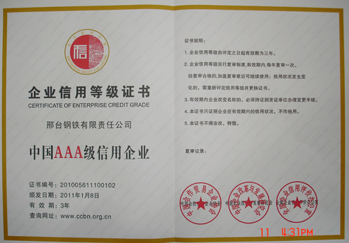 2011年1月,邢鋼被評(píng)選為“中國(guó)AAA級(jí)信用企業(yè)”。