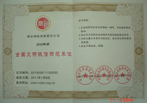 邢鋼榮獲“2010年度全國(guó)文明誠(chéng)信示范單位”稱號(hào)