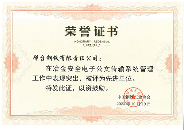 2024年1月,河北省應(yīng)急管理與安全生產(chǎn)協(xié)會授予邢鋼“2023年度應(yīng)急管理與安全生產(chǎn)先進(jìn)單位”稱號。