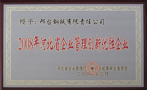 邢鋼榮獲“2008年河北省企業(yè)管理創(chuàng)新優(yōu)勝企業(yè)”榮譽(yù)稱號(hào)