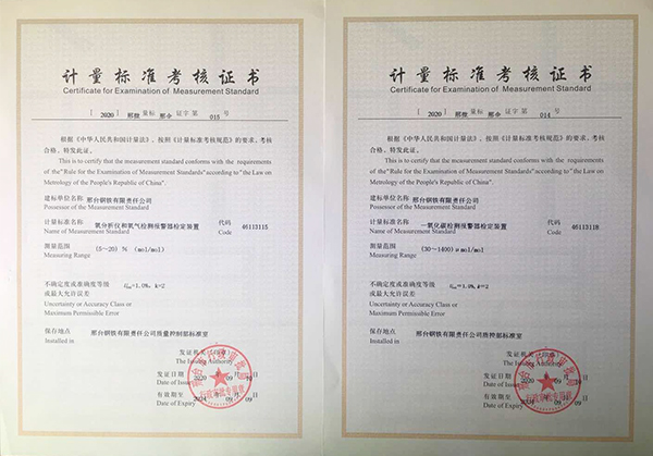 近日獲悉,邢鋼兩項(xiàng)企業(yè)最高計(jì)量標(biāo)準(zhǔn)《一氧化碳檢測報(bào)警器檢定裝置》和《氧分析儀和氧氣檢測報(bào)警器檢定裝置》獲得由邢臺市行政審批局頒發(fā)的《計(jì)量標(biāo)準(zhǔn)考核證書》。截至目前,邢鋼最高計(jì)量標(biāo)準(zhǔn)由15項(xiàng)增到17項(xiàng),專業(yè)范圍由5類增加到6類。