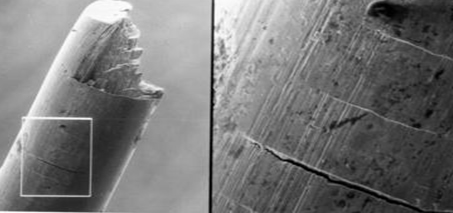 是一種階梯狀斷口,一般而言,橫向裂紋會(huì)離斷面很近,而且這些橫向的裂紋之間的距離很規(guī)則得分布在鋼絲的一側(cè),一般還伴有拉拔溝槽。
