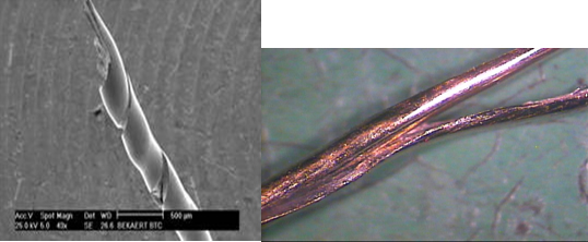 主要是指鋼絲在Bunching機(jī)器中由于鋼絲的塑性不夠,在扭轉(zhuǎn)時(shí)造成鋼絲呈螺旋狀分層斷裂,這主要發(fā)生在粗規(guī)格以及高強(qiáng)度直徑上。