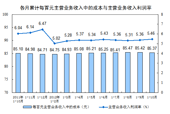 規(guī)模以上工業(yè)企業(yè)實(shí)現(xiàn)主營(yíng)業(yè)務(wù)收入736970億元,同比增長(zhǎng)10.3%。每百元主營(yíng)業(yè)務(wù)收入中的成本為85.37元,主營(yíng)業(yè)務(wù)收入利潤(rùn)率為5.46%。