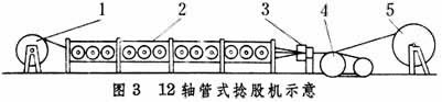 卷線:將鋼絲線盤,重新卷在捻股機的工字輪上;也可將鋼絲從拔絲機后直接卷到工字輪上;捻股:將鋼絲捻成繩股。捻股機有筐籃式、軸管式、無管式和雙捻機等。圖3為12軸管式捻股機示意圖,1是裝下層繩股的工字輪,2是旋轉的機筒,內裝12個卷滿鋼絲的工字輪,3是成股的壓線瓦,4是牽引輪,5是上層繩股的收線輪,機筒旋轉一周,牽引輪引出的繩股長度即為股的捻距。