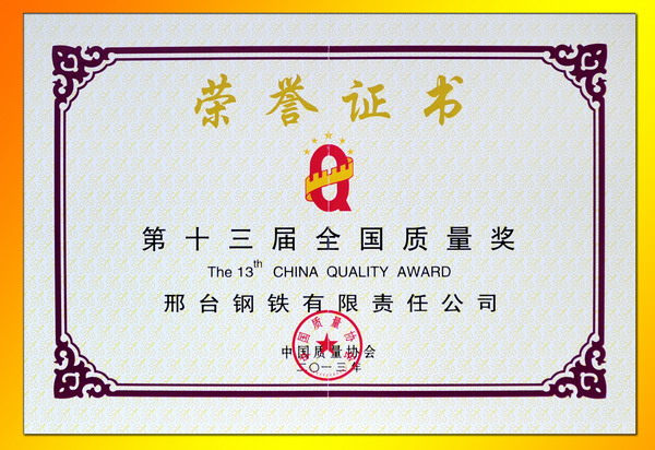 In November 3rd, the National Excellence Pursuit Conference, organized by the China Quality Association, was held in Beijing. The theme of the conference is Scientific Development -- the Realization of Quality Improvement. Xingtai Steel’s board chairman, Mr. Yuan Shizhen, and general manager, Mr. Zhang Yongcang attended the meeting and received the China Quality Award, the highest honor of national quality management. Xingtai Steel has also became the only metallurgy enterprise within the 11 winners.