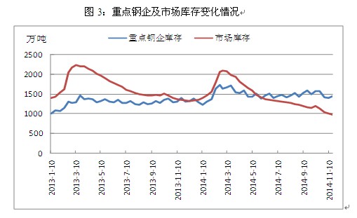 其三,鋼廠經(jīng)營(yíng)風(fēng)險(xiǎn)有所上升。由于近兩年鋼價(jià)持續(xù)大幅下跌,市場(chǎng)上的鋼貿(mào)商苦不堪言,相較于家大業(yè)大且有地方政府扶持的鋼廠,鋼貿(mào)商的日子更加難熬,在持續(xù)虧損以及資金壓力下,超半數(shù)鋼貿(mào)商選擇退出。依然活躍于市場(chǎng)的鋼貿(mào)商在操作上也不復(fù)以往的大開大合,小心謹(jǐn)慎成為了多數(shù)鋼貿(mào)商的選擇,由此帶來的直接后果就是市場(chǎng)庫(kù)存向鋼廠庫(kù)存轉(zhuǎn)移。截止2014年10月末,全國(guó)主要城市鋼材庫(kù)存約為1043萬(wàn)噸,較2013年同期相比大幅下降25.7%,與之相反的是,此時(shí)重點(diǎn)鋼企庫(kù)存增加到1414.3萬(wàn)噸,較2013年同期上升9.8%,隨著鋼貿(mào)商 “蓄水池”功能的減弱,鋼廠對(duì)于價(jià)格調(diào)整以及生產(chǎn)策略的變動(dòng)將更為敏感,但與此同時(shí)鋼廠也將承擔(dān)更大的經(jīng)營(yíng)風(fēng)險(xiǎn)。