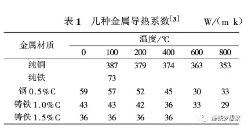 2000年以來(lái)銅冷卻壁以其良好的導(dǎo)熱能力和形成渣皮能力在我國(guó)高爐上得到廣泛的使用,目前全國(guó)約200座以上的高爐采用銅冷卻壁,尤其是在爐腹、爐腰和爐身下部等熱負(fù)荷較高的區(qū)域。高爐冷卻壁主要包括鑄鐵和純銅,另外還出現(xiàn)過(guò)鑄鋼冷卻壁。鑄鐵冷卻壁抗熱震性能差、導(dǎo)熱系數(shù)低。另外,其冷卻水管是鑄入鑄鐵本體內(nèi)的,由于材質(zhì)和膨脹系數(shù)的不同,形成氣隙層,而影響了傳熱。這些缺陷限制了鑄鐵冷卻壁的進(jìn)一步發(fā)展。因此,從上世紀(jì)70年代歐洲開發(fā)和使用了銅冷卻壁,得到較好的效果。表1為幾種不同金屬導(dǎo)熱系數(shù),可以看出純銅的導(dǎo)熱系數(shù)遠(yuǎn)優(yōu)于其他材料。