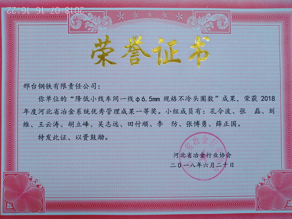 河北省冶金行業(yè)協(xié)會(huì)于6月份在秦皇島召開(kāi)了“全省冶金行業(yè)質(zhì)量管理優(yōu)秀成功發(fā)布會(huì)”,邢鋼線材廠小線車(chē)間工藝技術(shù)QC小組《降低小線車(chē)間一線6.5mm規(guī)格不冷頭圈數(shù)》在發(fā)布會(huì)上進(jìn)行了成功發(fā)布,獲得本次發(fā)布會(huì)一等獎(jiǎng)的好成績(jī)。