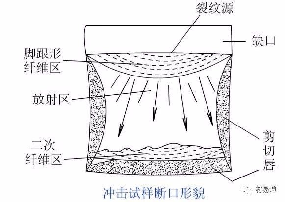沖擊試樣斷口:沖擊試樣沖斷口的斷裂表面及臨近表面的區(qū)域。其宏觀外貌一般呈晶狀,纖維狀或混合狀。