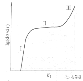 當(dāng)裂紋尖端的KI>KISCC時(shí),裂紋就會(huì)不斷擴(kuò)展。單位時(shí)間內(nèi)裂紋的擴(kuò)展量叫做應(yīng)力腐蝕裂紋擴(kuò)展速率,用da/dt表示。裂紋的擴(kuò)展速率da/dt隨著應(yīng)力強(qiáng)度因子K1而變化。
