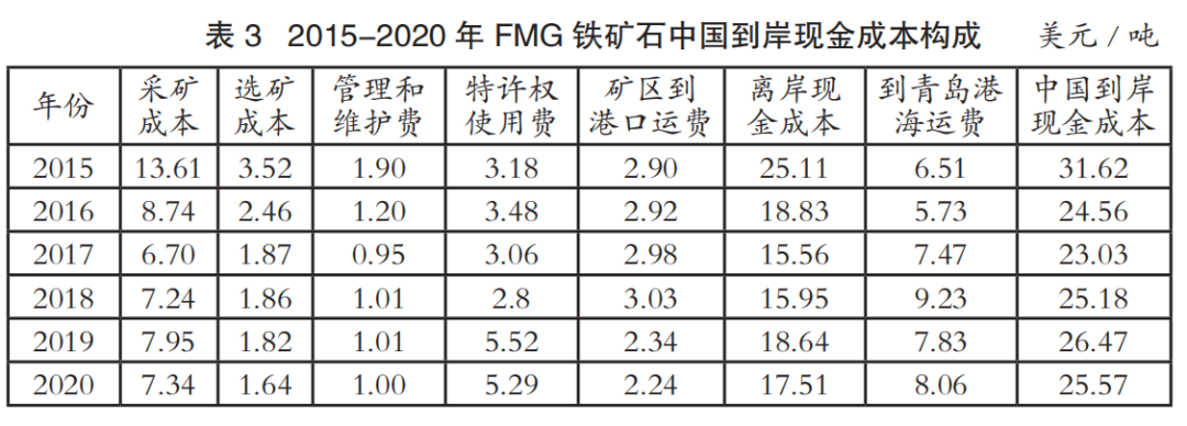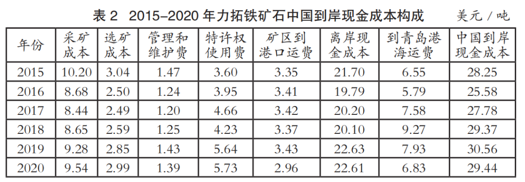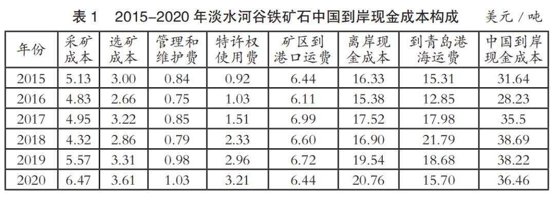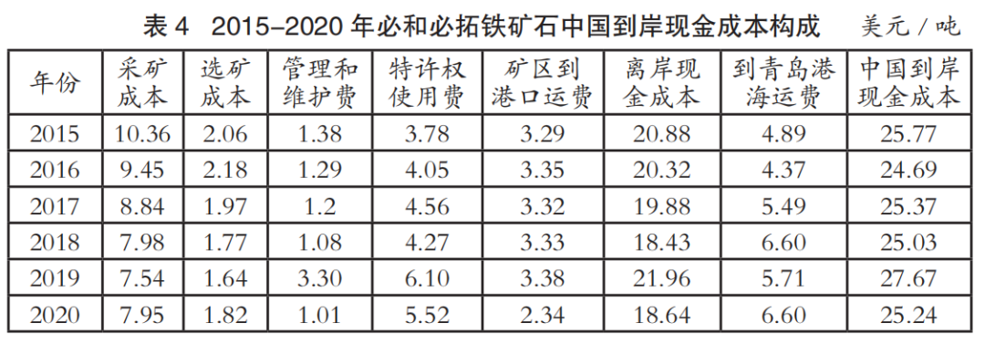 中國進(jìn)口鐵礦石到岸成本主要由離岸現(xiàn)金成本和海運(yùn)成本兩部分構(gòu)成。表1至表4為2015-2020年國際四大礦鐵礦石中國到岸現(xiàn)金成本構(gòu)成情況(數(shù)據(jù)來源:AME),其中離岸現(xiàn)金成本由采礦成本、選礦成本、管理和維護(hù)費、特許權(quán)使用費和礦區(qū)到港口運(yùn)費構(gòu)成;中國到岸現(xiàn)金成本由離岸現(xiàn)金成本和到青島港海運(yùn)費構(gòu)成;該成本數(shù)據(jù)僅為現(xiàn)金成本,不含國際四大礦的融資、折舊費用。