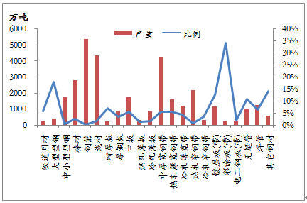1-5月份,我國共出口鋼材1791.7萬噸,棒線材、角型材、板材、鋼管、鐵道用材和其它用材分別占11.4%、5.9%、60.1%、15.4%、1.0%和6.2%,板材所占份額最大,棒線材和鋼管次之。就前5個月出口量而言,退稅取消的鋼材品種出口數(shù)量為703.3萬噸,占1-5月份鋼材出口總量的39.3%。雖然鋼材總出口量只占到國內(nèi)產(chǎn)量的5.1%,但仍有部分品種出口占產(chǎn)量的比例較大,對出口具有一定依賴性。鍍鋅板、熱軋板卷、中厚板和大型型鋼的出口數(shù)量占產(chǎn)量的比例較大,在出口稅率下調(diào)的情況下,國內(nèi)資源供應(yīng)的壓力將會明顯增大,從而影響到國內(nèi)價格的運(yùn)行。不過,在政策執(zhí)行日期之前,出口企業(yè)必定要加緊落實(shí)前期簽訂的合同,熱軋卷等品種的出口可能會加大,對國內(nèi)鋼材市場將是利好。