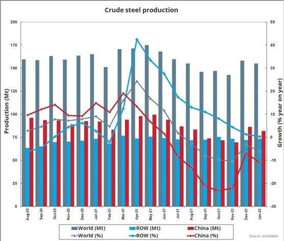 2022年1月全球64個(gè)納入世界鋼鐵協(xié)會(huì)統(tǒng)計(jì)國(guó)家的粗鋼產(chǎn)量為1.550億噸,同比下降6.1%。