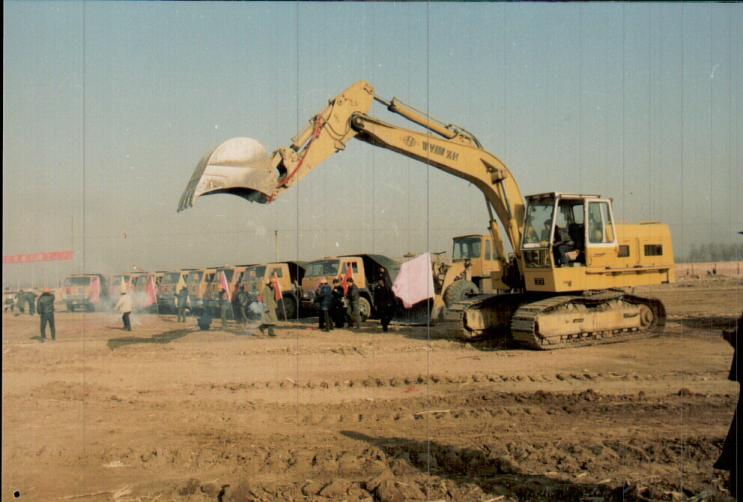 圖為1995年破土動工建設(shè)的場景,鞭炮的硝煙尚未消散,挖掘機抬起挖斗正要挖下第一鏟,運輸車整裝待發(fā),“煉鋼”來了!
