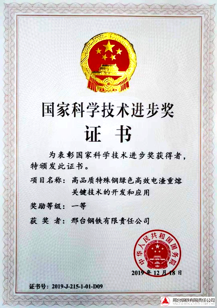 2019邢鋼“高品質(zhì)特殊鋼綠色高效電渣重熔關(guān)鍵技術(shù)的開發(fā)和應(yīng)用”還榮獲國家科學(xué)技術(shù)進步獎一等獎。