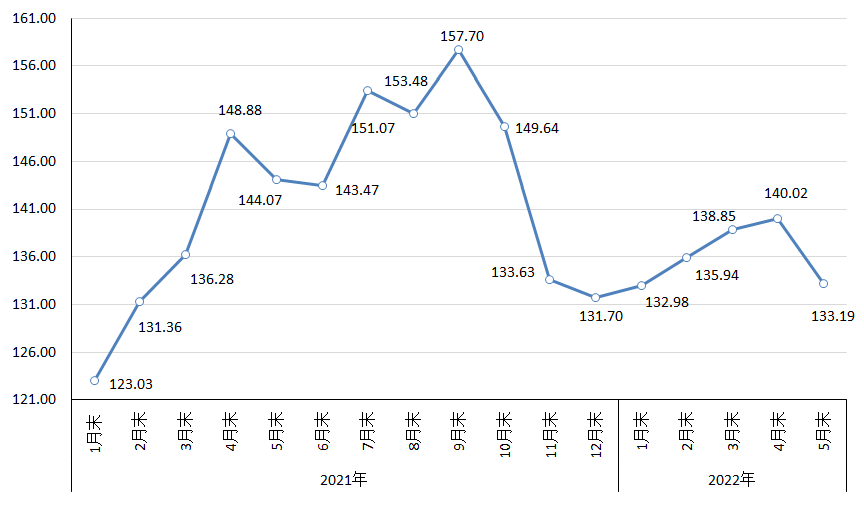 據(jù)鋼鐵協(xié)會監(jiān)測,5月末,中國鋼材價格指數(shù)(CSPI)為133.19點,環(huán)比由升轉降,下降6.83點,降幅為4.88%;同比下降10.88點,降幅為7.55%。(見下圖)