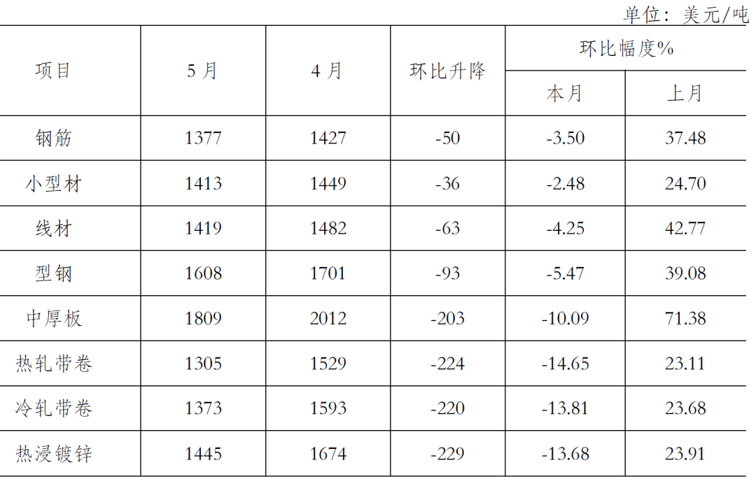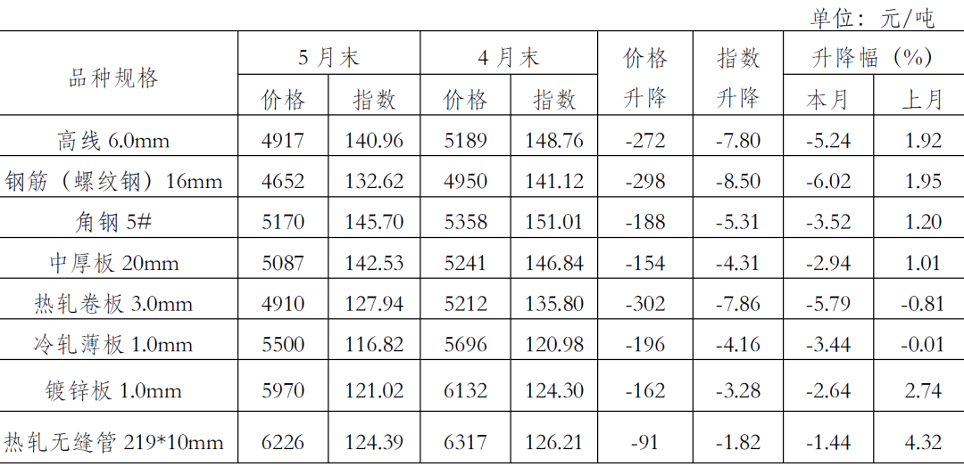 5月末,鋼鐵協(xié)會監(jiān)測的八大鋼材品種價格均有所下降。其中,熱軋卷板和冷軋薄板繼續(xù)下降,且降幅較上月有所加大,環(huán)比分別下降302元/噸和196元/噸;高線、三級鋼筋、角鋼、中厚板、鍍鋅板和熱軋無縫管價格由升轉降,環(huán)比分別下降272元/噸、298元/噸、188元/噸、154元/噸、162元/噸和91元/噸。(見下表)