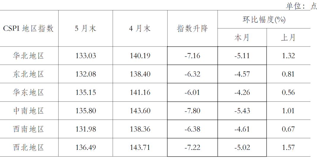 5月份,CSPI全國六大地區(qū)鋼材價格指數(shù)均由升轉降。其中中南地區(qū)降幅較大,環(huán)比下降5.43%;華東地區(qū)降幅較小,環(huán)比下降4.26%;華北、東北、西南和西北地區(qū)鋼價指數(shù)環(huán)比分別下降5.11%、4.57%、4.61%和5.02%。(見下表)