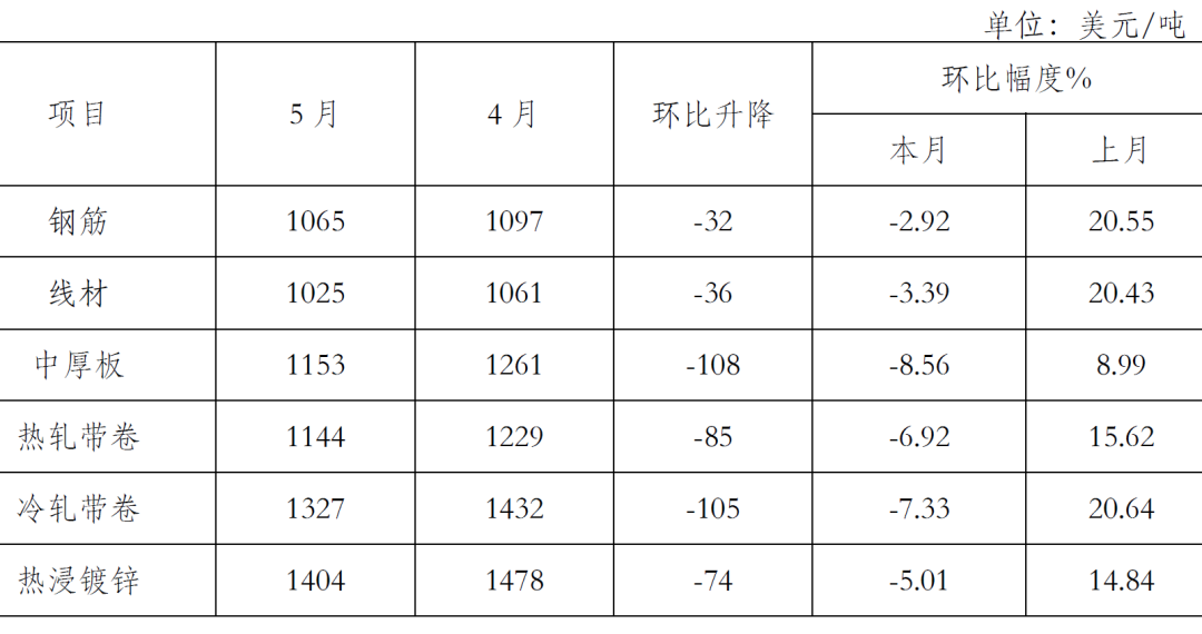 5月份,鋼鐵產(chǎn)量持續(xù)環(huán)比增長。吉林,上海等疫情嚴重地區(qū)開始復工復產(chǎn)、國家穩(wěn)增長政策相繼出臺,對需求的拉動還不明顯,國內市場鋼材需求增長不及預期,加上鋼鐵生產(chǎn)環(huán)比增長,以及原燃材料價格在前期大漲后有所回落,致使鋼材價格呈小幅下行走勢。