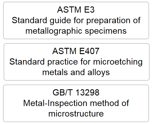國際上與金相試樣制備相關的標準有我國標準GB/T 13298《金相顯微組織檢驗方法》和美國標準ASTM E3《金相試樣的制備》、ASTM E407《金屬和合金的微觀浸蝕》。我國標準GB/T 13298的前半部分“金相試樣的制備方法”與ASTM E3和ASTM E407內容類似,但ISO一直沒有金相試樣制備的相關標準。