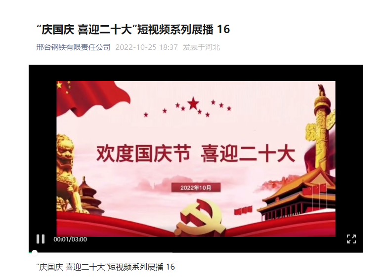 二十大期間,邢鋼組織開展了“慶國慶,喜迎二十大”邢鋼快閃短視頻、邢鋼故事短視頻作品征集活動,展示了公司良好的企業(yè)形象和員工的精神風(fēng)貌。目前,短視頻作品正在通過邢鋼“企業(yè)微信”、微信公眾號平臺和公司內(nèi)網(wǎng)“視頻新聞”欄目陸續(xù)展播中。