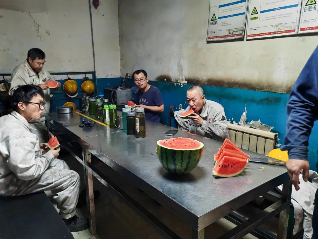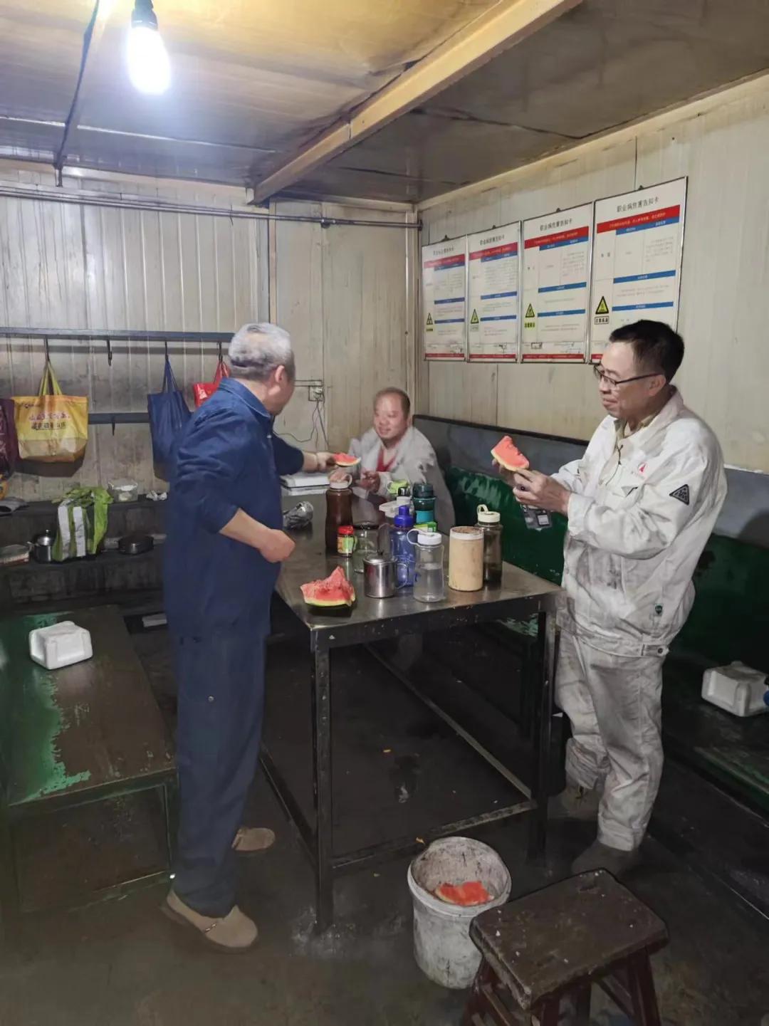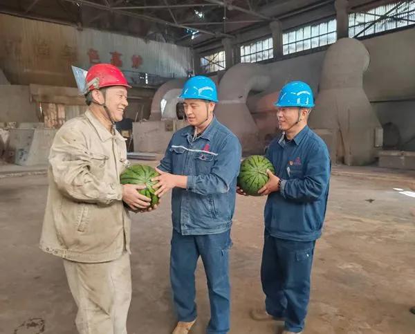 “天氣炎熱,大家辛苦了”,在爐前,侯副總親自把西瓜送到員工手里,并送上節(jié)日的祝福“端午安康!”希望大家在工作中注意做好防暑降溫,避免中暑,工作中合理分配體力,既要保證西場主溝澆筑過程安全,又要保證東場單場出鐵過程安全。在二燒混合機(jī)檢修現(xiàn)場,侯總了解檢修進(jìn)度,叮囑維修、燒結(jié)車間主任,要注意檢修過程人員安全,保證檢修質(zhì)量,為二燒設(shè)備穩(wěn)定運行奠定基礎(chǔ)。