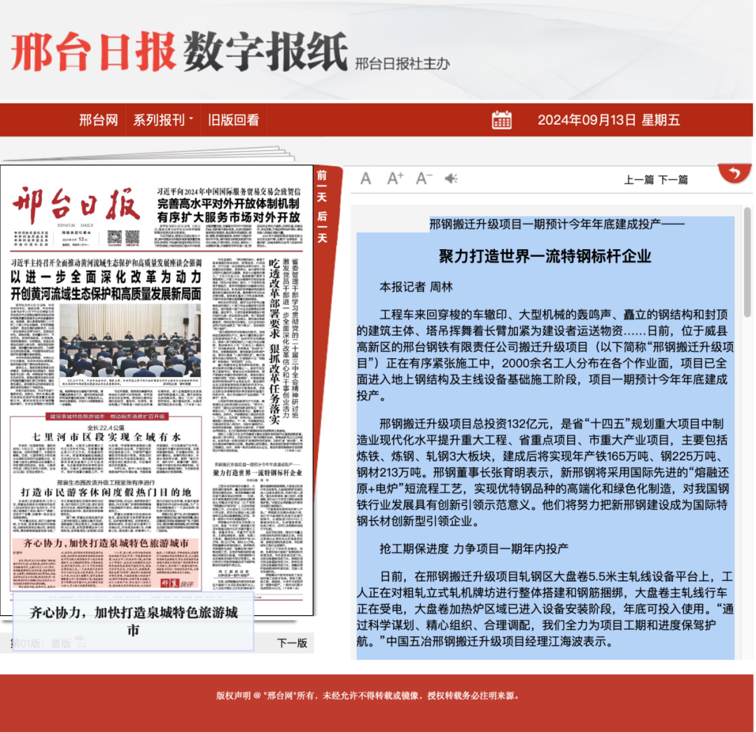工程車來回穿梭的車轍印、大型機(jī)械的轟鳴聲、矗立的鋼結(jié)構(gòu)和封頂?shù)慕ㄖ黧w、塔吊揮舞著長臂加緊為建設(shè)者運(yùn)送物資……日前,位于威縣高新區(qū)的邢臺(tái)鋼鐵有限責(zé)任公司搬遷升級(jí)項(xiàng)目(以下簡(jiǎn)稱“邢鋼搬遷升級(jí)項(xiàng)目”)正在有序緊張施工中,2000余名工人分布在各個(gè)作業(yè)面,項(xiàng)目已全面進(jìn)入地上鋼結(jié)構(gòu)及主線設(shè)備基礎(chǔ)施工階段,項(xiàng)目一期預(yù)計(jì)今年年底建成投產(chǎn)。