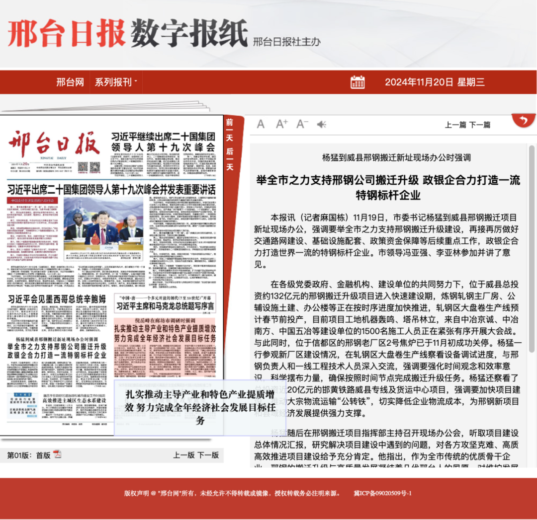 楊猛隨后在邢鋼搬遷項目指揮部主持召開現(xiàn)場辦公會,聽取項目建設總體情況匯報,研究解決項目建設中遇到的問題,對各方攻堅克難、高質高效推進項目建設給予充分肯定。他指出,作為全市傳統(tǒng)的優(yōu)質骨干企業(yè),邢鋼的搬遷升級與高質量發(fā)展凝結著幾代邢臺人的夙愿,對維護發(fā)展穩(wěn)定大局、實現(xiàn)全市跨越趕超意義重大,全市上下要搶抓“百泉復涌”歷史新機遇,增強務實擔當?shù)呢熑胃泻头置氡貭幍木o迫感,搶抓黃金施工期,舉全市之力破解關鍵難題、強化要素保障,全力推動邢鋼新廠區(qū)盡快建成投產、老廠區(qū)按時關停。威縣要提高站位、統(tǒng)一思想,一鼓作氣推進服務保障工作,積極組織銀企對接、產業(yè)招商、產品推介等活動,引導形成全社會支持邢鋼發(fā)展的良好氛圍,切實放大邢鋼新廠輻射帶動效應,努力打造獨具特色的特鋼產業(yè)集群。各金融機構要形成工作合力,創(chuàng)新金融產品,主動加強與企業(yè)對接服務,積極爭取上級金融機構支持,為項目建設提供堅實保障。市直相關部門要積極對接項目建設,提前介入、靠前服務,吃透用好各項有利政策,拿出幫助搬遷建設的硬政策硬舉措,形成推動后續(xù)發(fā)展的政策合力,把邢鋼打造成為我市新材料產業(yè)的強力支撐。