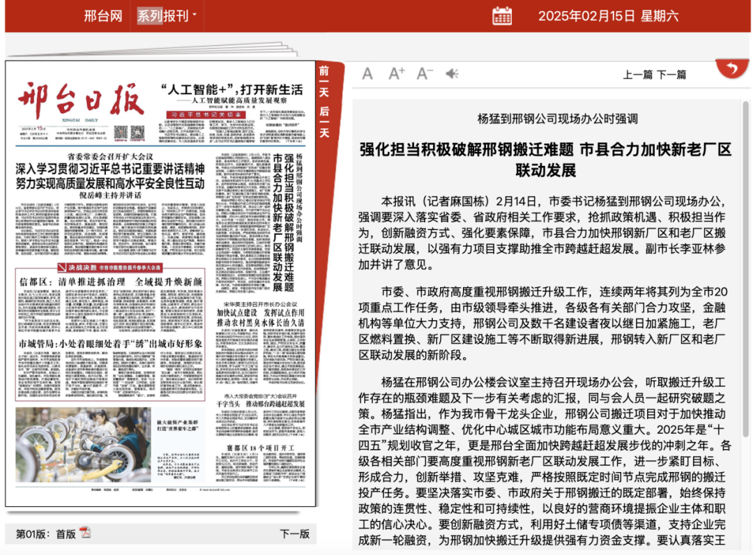 楊猛在邢鋼公司辦公樓會(huì)議室主持召開(kāi)現(xiàn)場(chǎng)辦公會(huì),聽(tīng)取搬遷升級(jí)工作存在的瓶頸難題及下一步有關(guān)考慮的匯報(bào),同與會(huì)人員一起研究破題之策。楊猛指出,作為我市骨干龍頭企業(yè),邢鋼公司搬遷項(xiàng)目對(duì)于加快推動(dòng)全市產(chǎn)業(yè)結(jié)構(gòu)調(diào)整、優(yōu)化中心城區(qū)城市功能布局意義重大。2025年是“十四五”規(guī)劃收官之年,更是邢臺(tái)全面加快跨越趕超發(fā)展步伐的沖刺之年。各級(jí)各相關(guān)部門(mén)要高度重視邢鋼新老廠區(qū)聯(lián)動(dòng)發(fā)展工作,進(jìn)一步緊盯目標(biāo)、形成合力,創(chuàng)新舉措、攻堅(jiān)克難,嚴(yán)格按照既定時(shí)間節(jié)點(diǎn)完成邢鋼的搬遷投產(chǎn)任務(wù)。要堅(jiān)決落實(shí)市委、市政府關(guān)于邢鋼搬遷的既定部署,始終保持政策的連貫性、穩(wěn)定性和可持續(xù)性,以良好的營(yíng)商環(huán)境提振企業(yè)主體和職工的信心決心。要?jiǎng)?chuàng)新融資方式,利用好土儲(chǔ)專(zhuān)項(xiàng)債等渠道,支持企業(yè)完成新一輪融資,為邢鋼加快搬遷升級(jí)提供強(qiáng)有力資金支撐。要認(rèn)真落實(shí)王正譜省長(zhǎng)在邢臺(tái)現(xiàn)場(chǎng)辦公會(huì)相關(guān)要求,全力加快威縣邢鋼鐵路專(zhuān)用線(xiàn)專(zhuān)項(xiàng)債項(xiàng)目,推動(dòng)邯黃鐵路威縣專(zhuān)線(xiàn)及貨運(yùn)中心項(xiàng)目建設(shè),切實(shí)降低邢鋼公司物流成本。要堅(jiān)持片區(qū)開(kāi)發(fā)思維,啟動(dòng)邢鋼老廠區(qū)及周邊區(qū)域綜合利用、招商引資、工業(yè)遺產(chǎn)開(kāi)發(fā)等規(guī)劃設(shè)計(jì),實(shí)現(xiàn)現(xiàn)有資源的有效盤(pán)活利用。邢鋼公司要堅(jiān)定信心,千方百計(jì)推進(jìn)搬遷升級(jí)項(xiàng)目早投產(chǎn)、早見(jiàn)效,在項(xiàng)目建設(shè)中當(dāng)先鋒、挑大梁,為投資消費(fèi)質(zhì)效年貢獻(xiàn)力量。