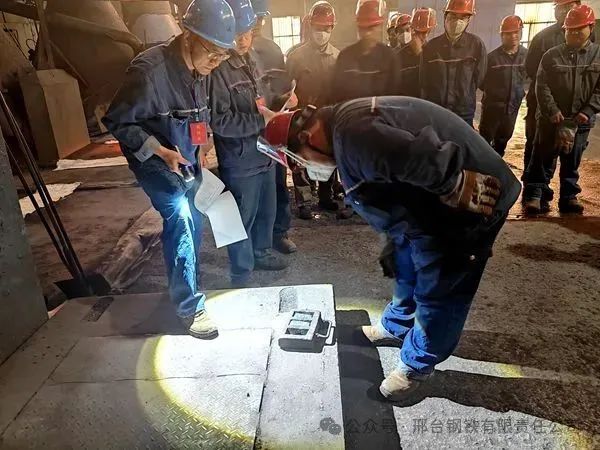 隨后,參賽選手列隊(duì)進(jìn)入東出鐵場實(shí)操區(qū)。實(shí)操考核緊密圍繞爐前工核心技能展開,具體項(xiàng)目包括:目測生鐵含Si(爐溫估測),檢驗(yàn)選手經(jīng)驗(yàn)積累,評分依據(jù)實(shí)測值與目測值的精確度(差值精度至小數(shù)點(diǎn)后兩位);打大錘,要求兩人一組協(xié)作完成,考核扶釬的穩(wěn)定性與揮錘的規(guī)范性(左五下、右五下)、力度和準(zhǔn)確性;目測鐵口深度,同樣考驗(yàn)選手經(jīng)驗(yàn)判斷的精確度(差值精度至小數(shù)點(diǎn)后兩位);更換鉆桿,選手需嚴(yán)格按照“檢查油管—關(guān)閥—換鉆桿—開閥—對講機(jī)溝通—設(shè)備潤滑”的標(biāo)準(zhǔn)化流程操作,評估操作的規(guī)范性與效率。